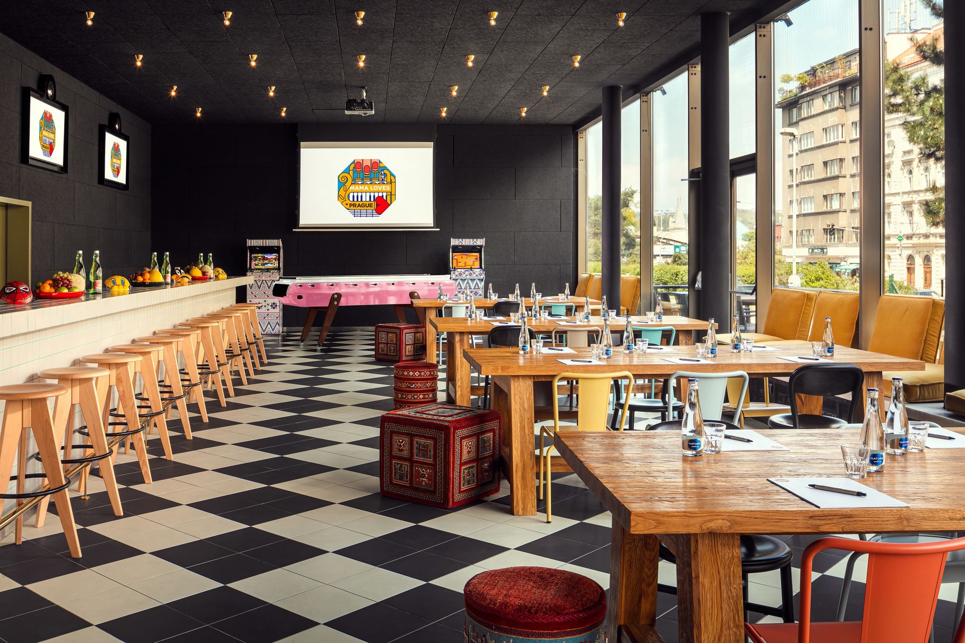 Moderní interiér s hravými detaily, plný barev s živou atmosférou, zkrátka ideální místo pro každou oslavu a večírek.